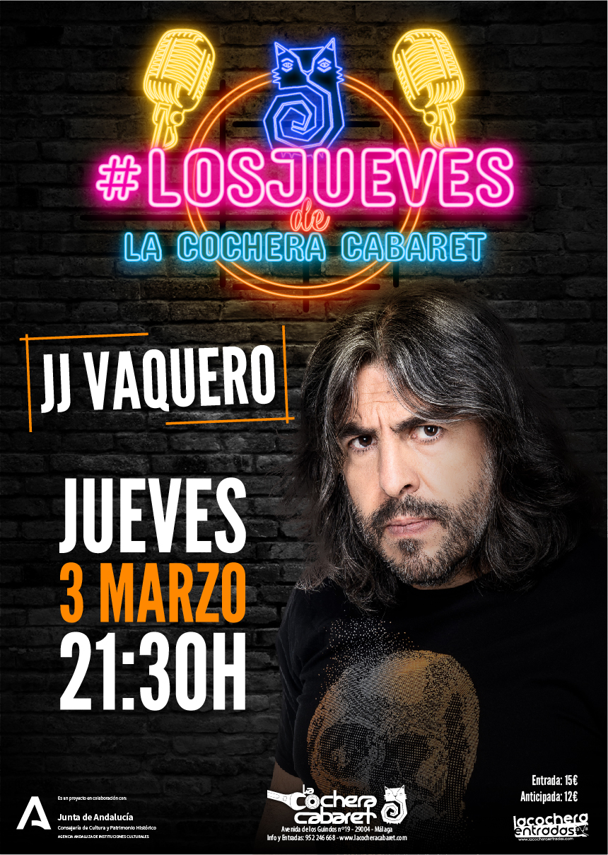 3 marzo, 2022 @ 9:30 pm JJ Vaquero en #LosJueves de La Cochera Cabaret La Cochera Cabaret Av. de los Guindos, 19, Málaga, Málaga, España 12€ – 15€