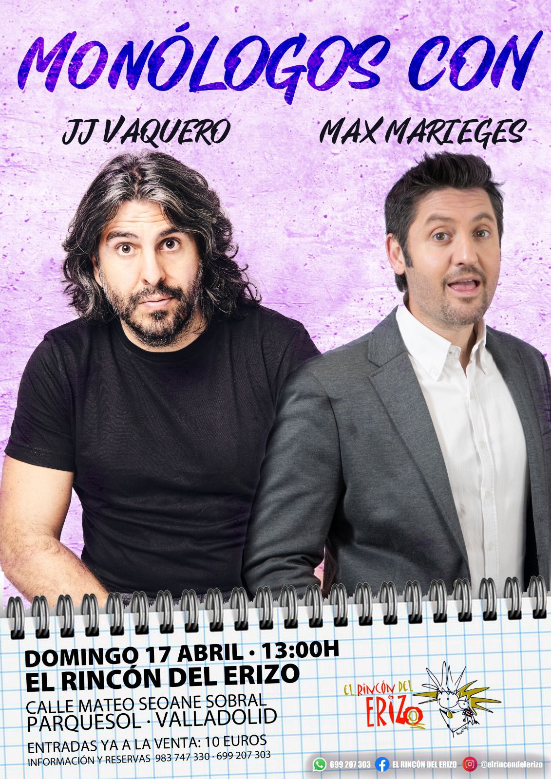 17 abril, 2022 @ 1:00 pm Monólogos con JJ Vaquero y Max Marieges en El Rincón Del Erizo El Rincon Del Erizo Calle Mateo Seoane Sobral 22, Valladolid, Valladolid, España 10€